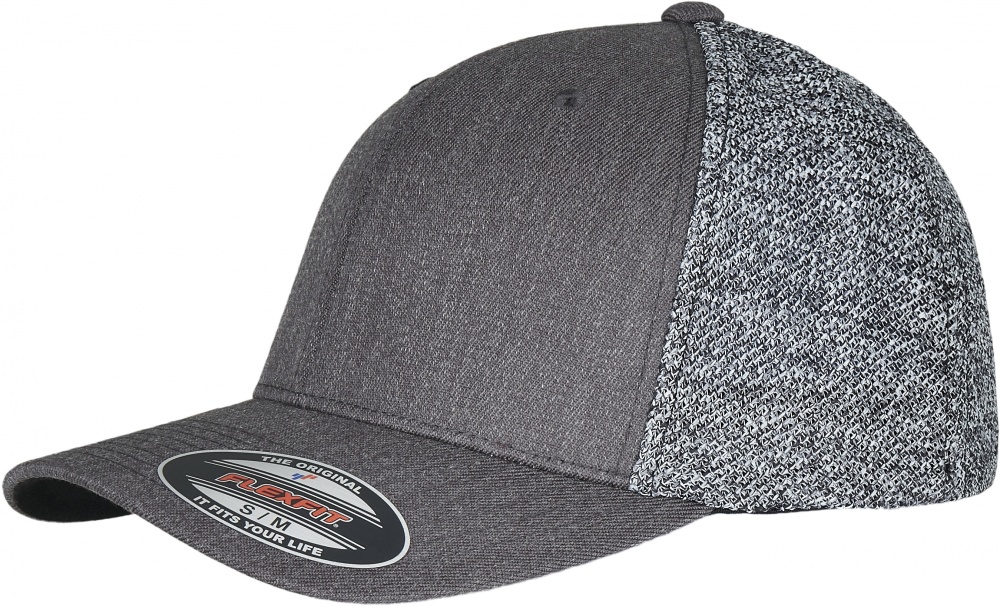 - Zweigeteilte Flexfit Kappe: vorne klassisch einfarbig und Rückseite mit einem Melange Tech Material