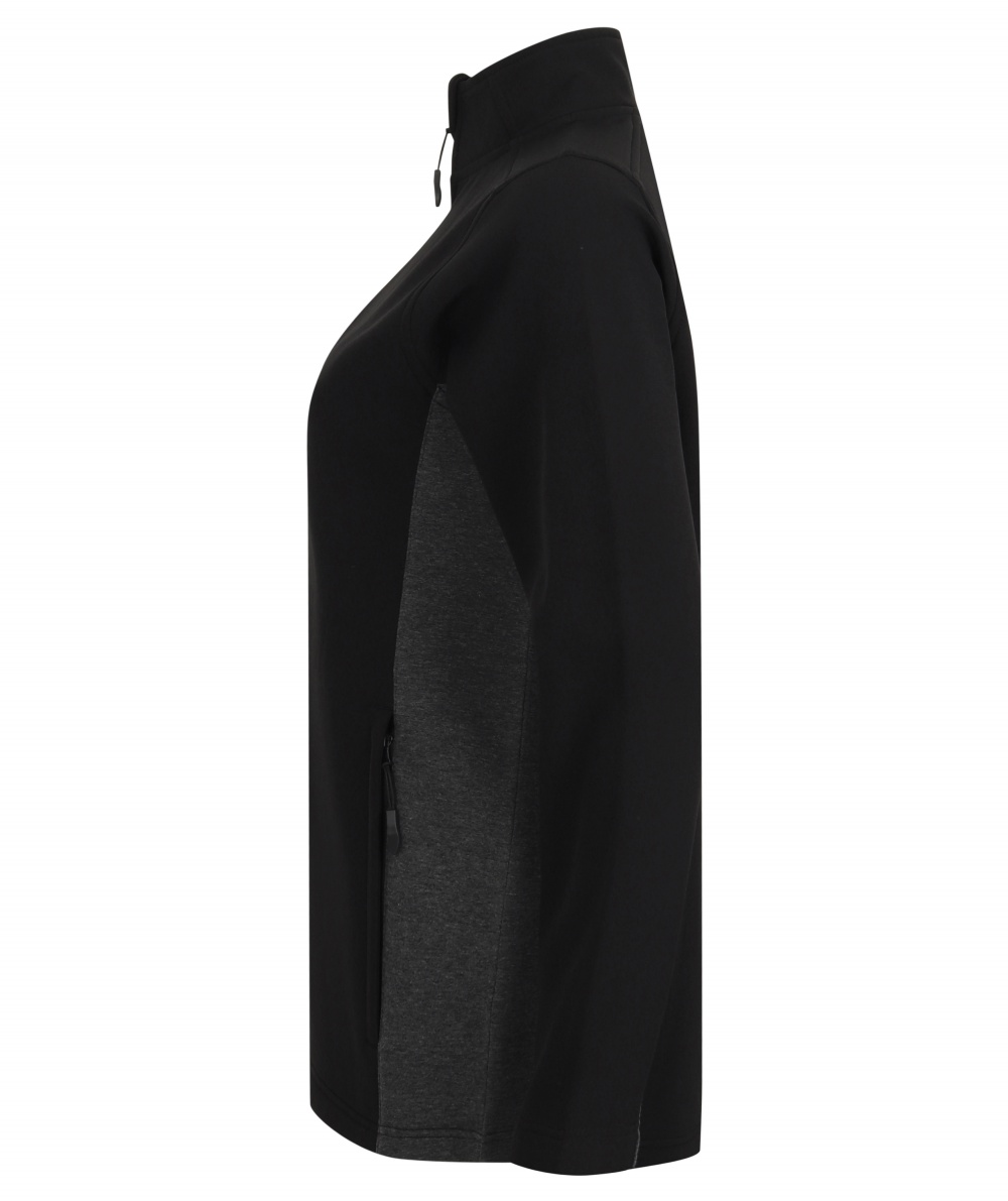 - Moderne Details wie kontrastierende, melierte Stretchseitenbahnen und mittiger Reißverschluss mit rutschfestem Schieber, verdeckte Reißverschluss-Taschen an den Seiten, Brusttasche, gebogener Saum, Abnäher an der Schulter und tiefe Innentasche für Telefon und Zubehör